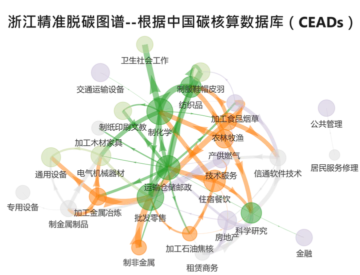 澳恪森结合中国碳核算数据库(CEADs)与自行研发的投入产出网络图可视化 来检视“减污降碳全景图”之浙江版本。