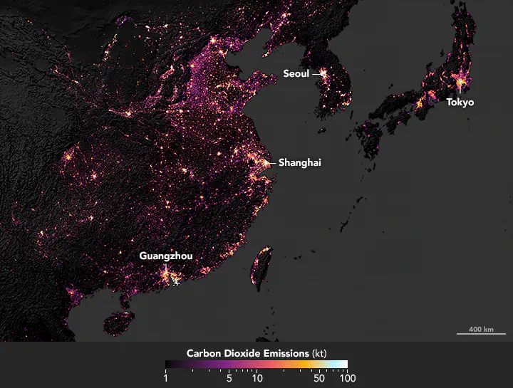 挪威NTNU研究世界13,000城市發現,富裕大城市的碳排高。[City Carbon Footprints] (http://citycarbonfootprints.info/),圖片來源NASA Earth Observatory