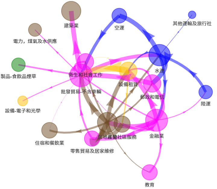 值得注意的是上行的是“水運”的關係網絡,不只和空運及陸運相關,更形構出如“水運↦空運↦批發貿易↦水運”、“水運↦金融業↦房地產業↦批發貿易”、“水運↦金融業↦郵政和電信↦批發貿易”等核心網絡關係。